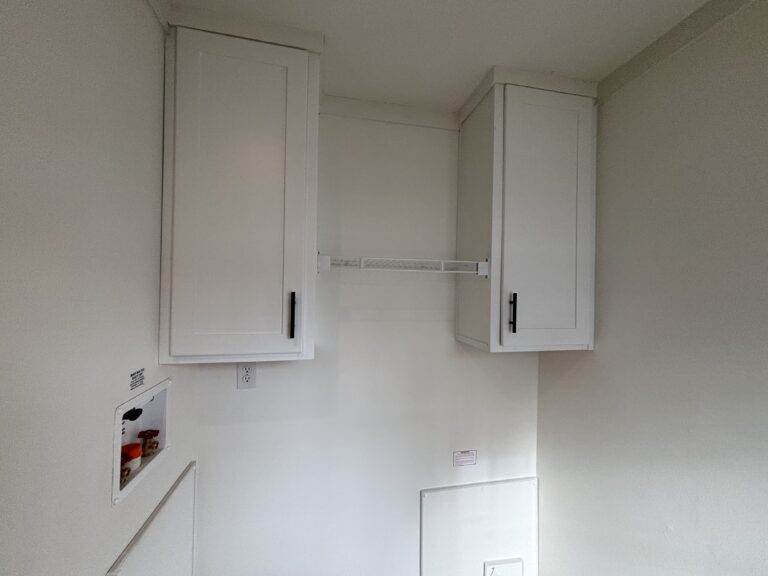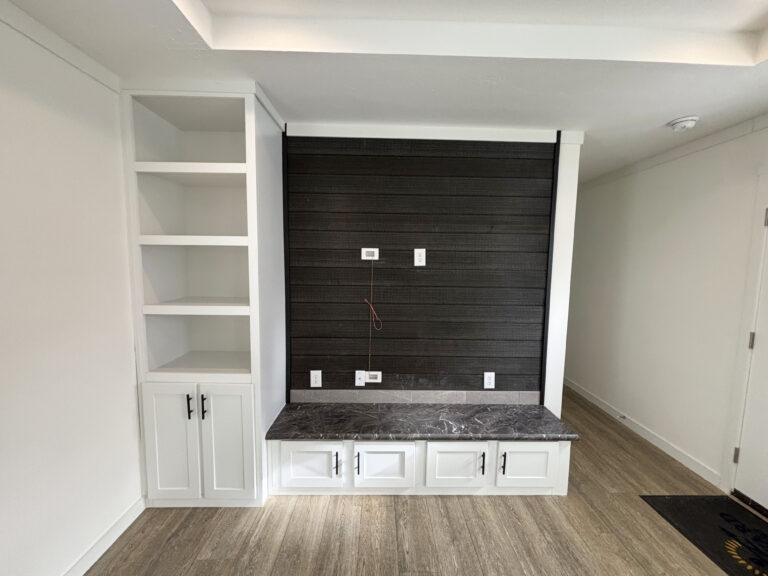 The spacious living room is a perfect gathering space, featuring a white built-in entertainment center, ideal for displaying your TV and décor while keeping everything neatly organized.