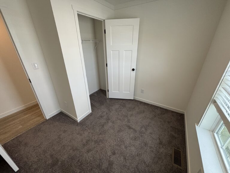 The primary suite offers a peaceful retreat, boasting a large double-door closet and a private ensuite bathroom. The stylish bath features a step-in shower with matte black fixtures, adding a modern and sophisticated touch.