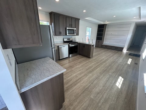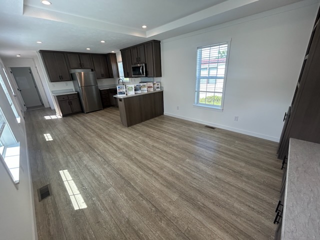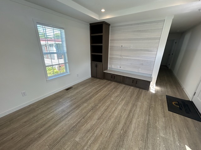 - Living Space: The open-concept layout boasts a bright and inviting living area featuring contemporary flooring, sophisticated tray ceilings, and large windows that fill the space with natural light.