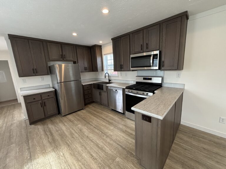 - Kitchen: A chef’s delight with stainless steel appliances, sleek countertops, and rich, dark wood cabinetry providing plenty of storage. The large farmhouse sink adds a stylish and practical touch.